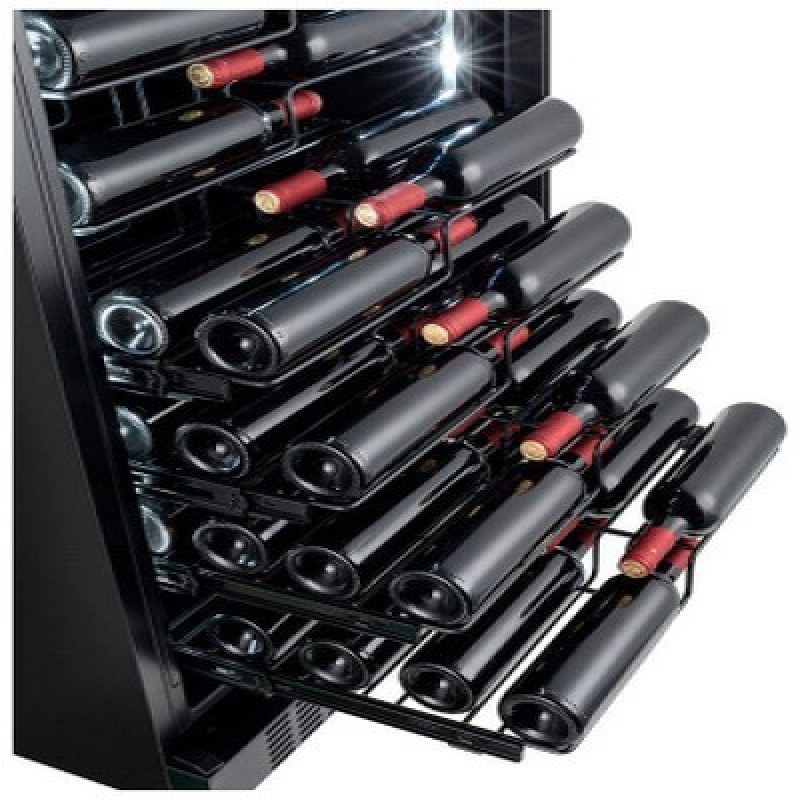 Общие данные:Размеры:высота: 183,5  смширина: 65,5 смглубина: 68 смОбъем: 490 лМаксимальное количество бутылок: 143Тип управления: электронныйКлиматический класс: N (от +16°C до +32°C)Класс энергопотребления: FГодовое энергопотребление (кВт*ч): 128Цвет корпуса: ЧёрныйЦвет дверцы: ЧёрныйКоличество температурных зон: 1Диапазон температур: 5-20°СТип системы охлаждения: компрессорныйВинное отделение:Полки: 12Подсветка (белая)Винный шкаф оборудован вентиляторами, которые обеспечивают циркуляцию воздуха. Конденсат в винном шкафу используется повторно и, таким образом, поддерживает оптимальную влажность, а фильтр с активированным углем обеспечивает свежий и чистый воздух в холодильнике для вина.Дополнительная информация:Винный шкаф оборудован специальными полками,  которые элегантно демонстрируют винные бутылки и этикетки вашей коллекции.Стеклопакет дверцы заполнен аргоном, что существенно снижает теплопотери, а УФ-фильтр защищает вино от вредных ультрафиолетовых лучей, которые могут проникнуть внутрь холодильника.Светодиодная подсветка находится сбоку для лучшей подсветки этикеток.Об охлаждении винного шкафа заботится тихий компрессор с низким уровнем шума и меньшим потреблением электроэнергии. Компрессор не только бесшумный, но и опирается на наши специально разработанные ножки, которые защищают вино от вредных вибраций.Замок двериХладагент: R600a Уровень шума (дБ): 40